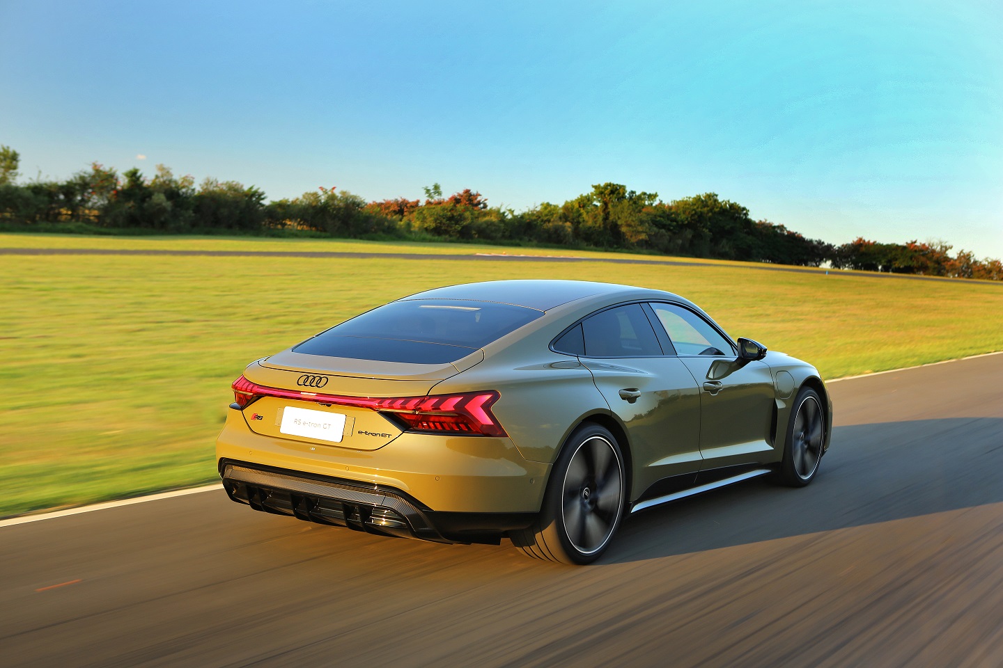 As luzes na traseira estão conectadas por uma faixa plana de luz. Um difusor visualmente dá ao RS e-tron GT um inconfundível visual dentro do portfólio de produtos da Audi. O aerofólio corre em paralelo à faixa de luz e arredonda o visual esportivo.