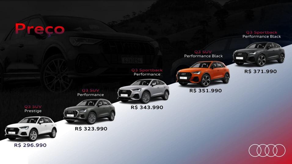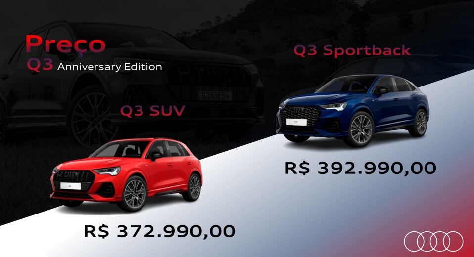 Limitada a apenas 100 unidades e projetada especialmente para o mercado brasileiro, a série especial chega com preços de R$ 372.990,00 (Q3) e R$ 392.990,00 (Q3 Sportback).