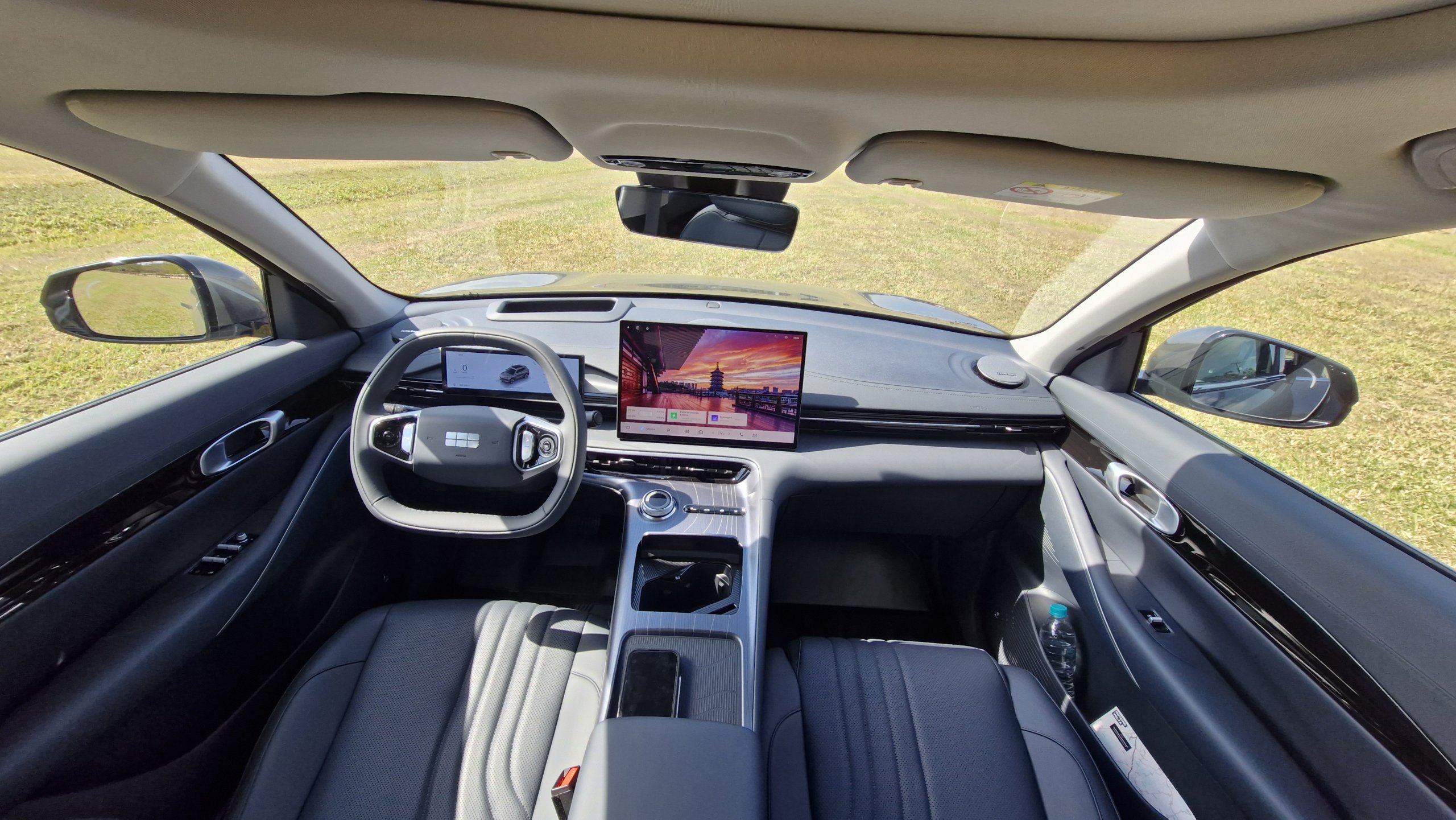Na mesma tela é possível ter acesso a câmera de alta resolução com imagens frontal e traseira. Já no painel de instrumentos a tela também é de ótima qualidade, porém, tem tamanho pequeno e lembra a do Volvo EX30, isso por que a Geely é dona da Volvo e ambas compartilham alguns itens.