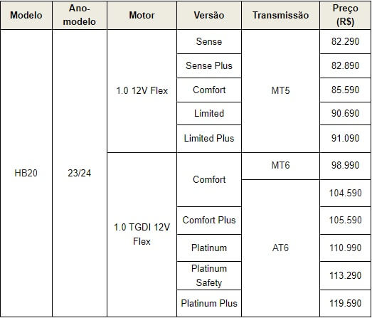 HB20 Limited Plus 1.0 MT – Com base no HB20 Limited, a nova configuração traz painel de instrumentos digital Supervision Cluster, chave presencial Smart Key, console central revestido em couro e maçanetas externas cromadas.