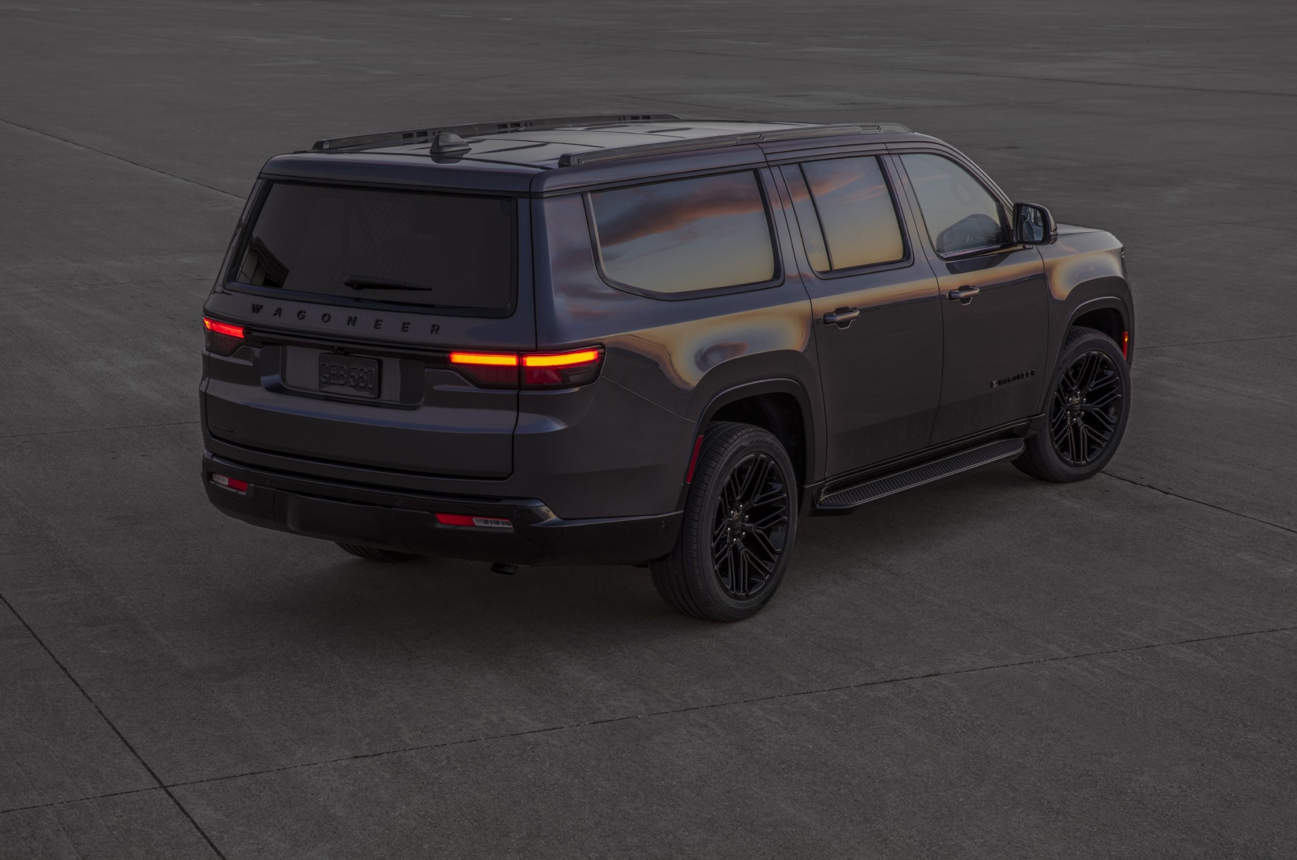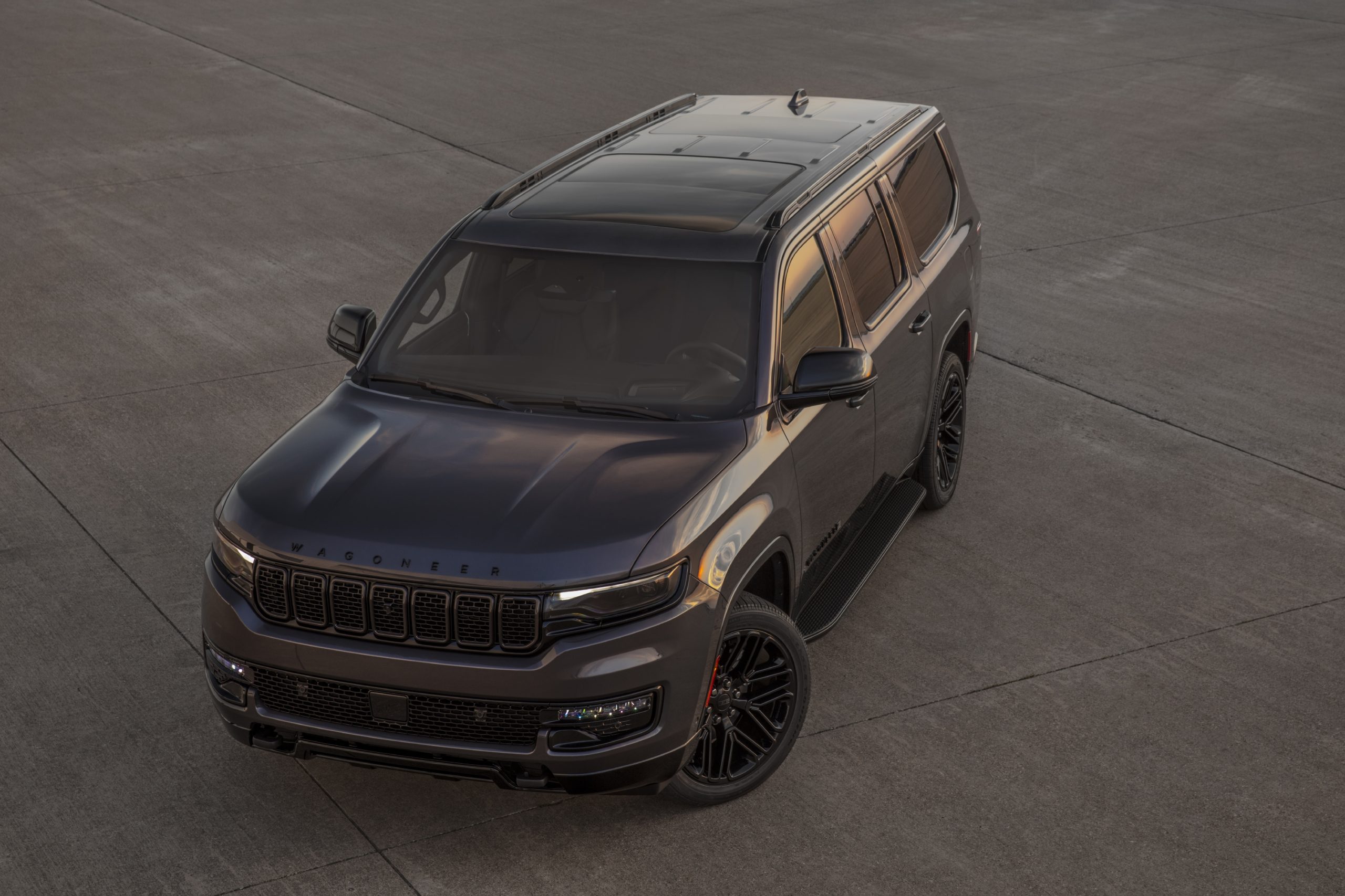 Rodas em preto brilhante, teto solar panorâmico de três painéis, anéis de grade em Black Onyx com grade pintada em preto brilhante, assim como os racks de teto, emblema, acabamento de janela, coberturas dos faróis e retrovisores.