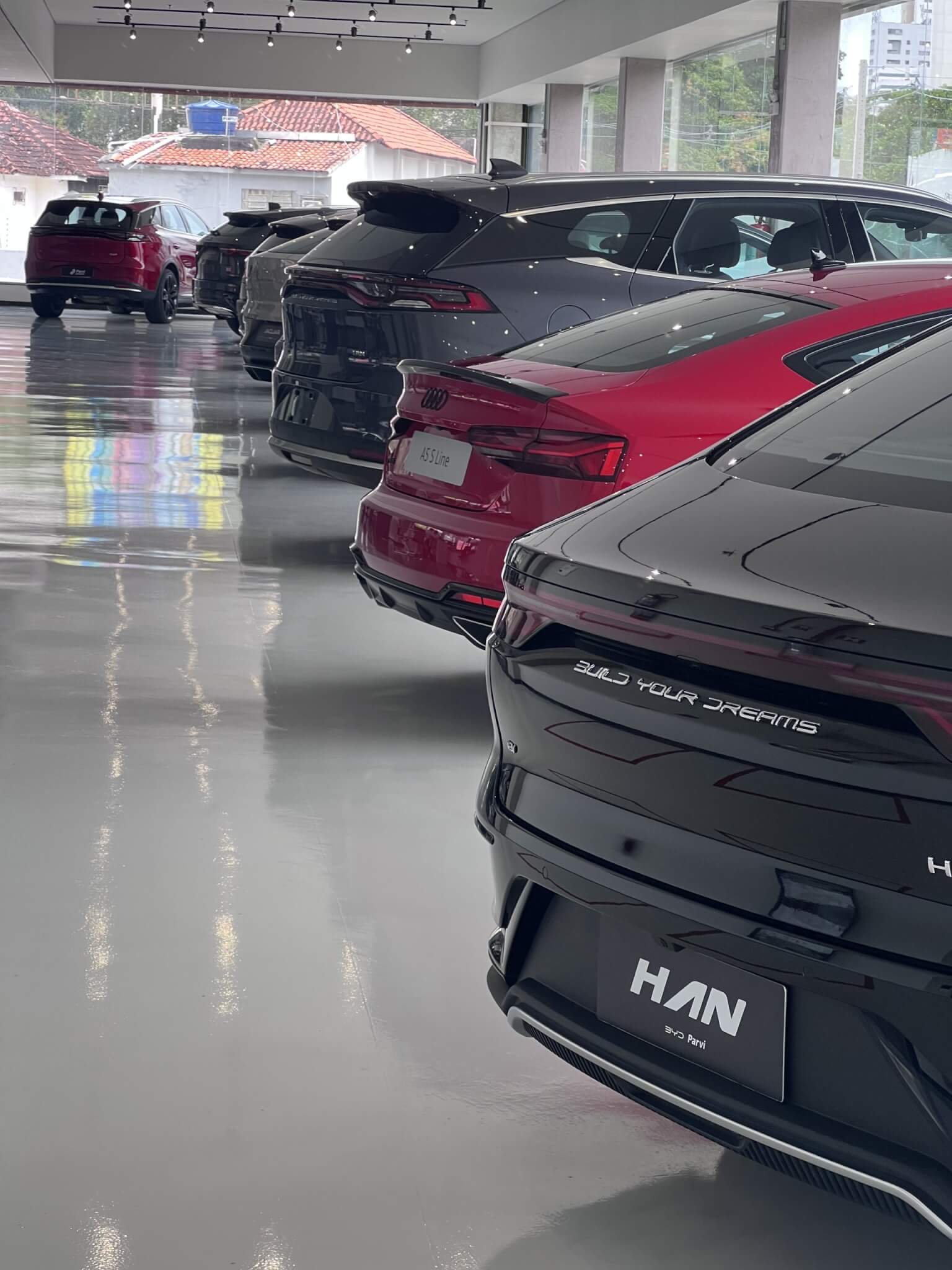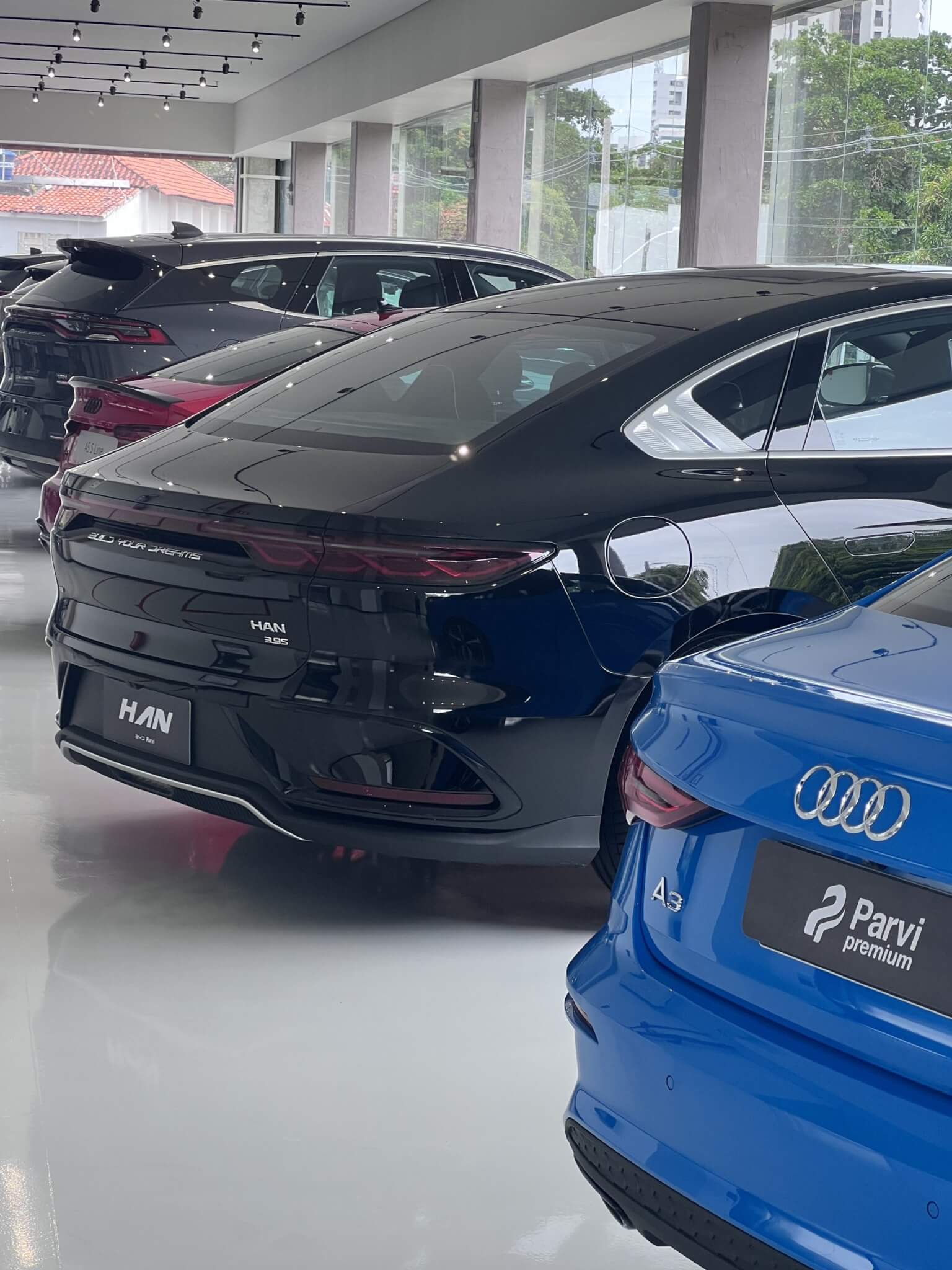 No salão da concessionária Parvi Premium é possível encontrar carros de marcas distintas de alto padrão lado a lado. Há Audi, BMW, Mercedes, Jaguar, Land Rover, Lexus, Porsche e até os elétricos da BYD, só para citar algumas.
