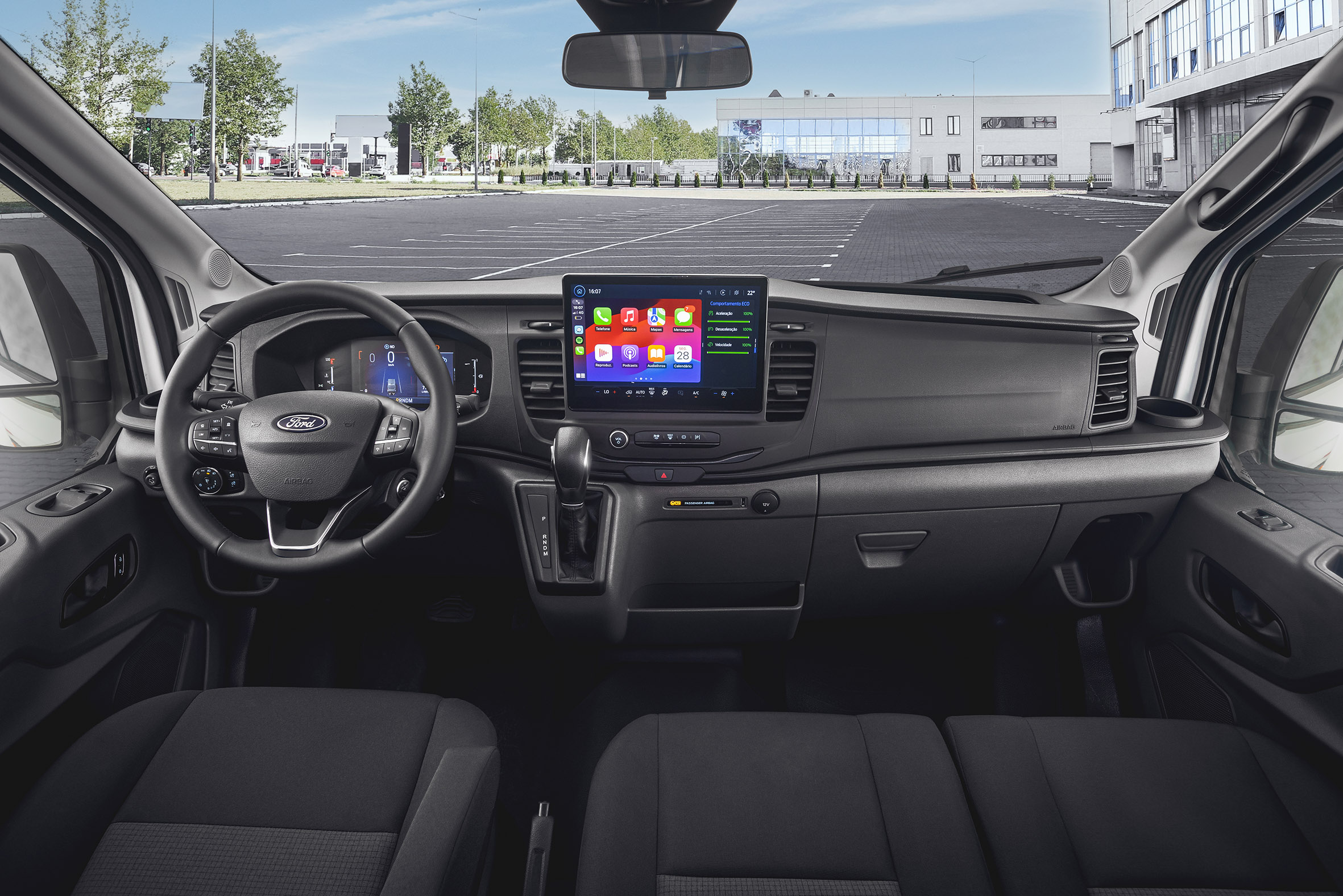 A Transit Chassi agora traz retrovisores com rebatimento elétrico, câmera de ré, sensor de estacionamento dianteiro, farol de neblina, piloto automático, monitoramento de pressão dos pneus, ar-condicionado digital e alarme.