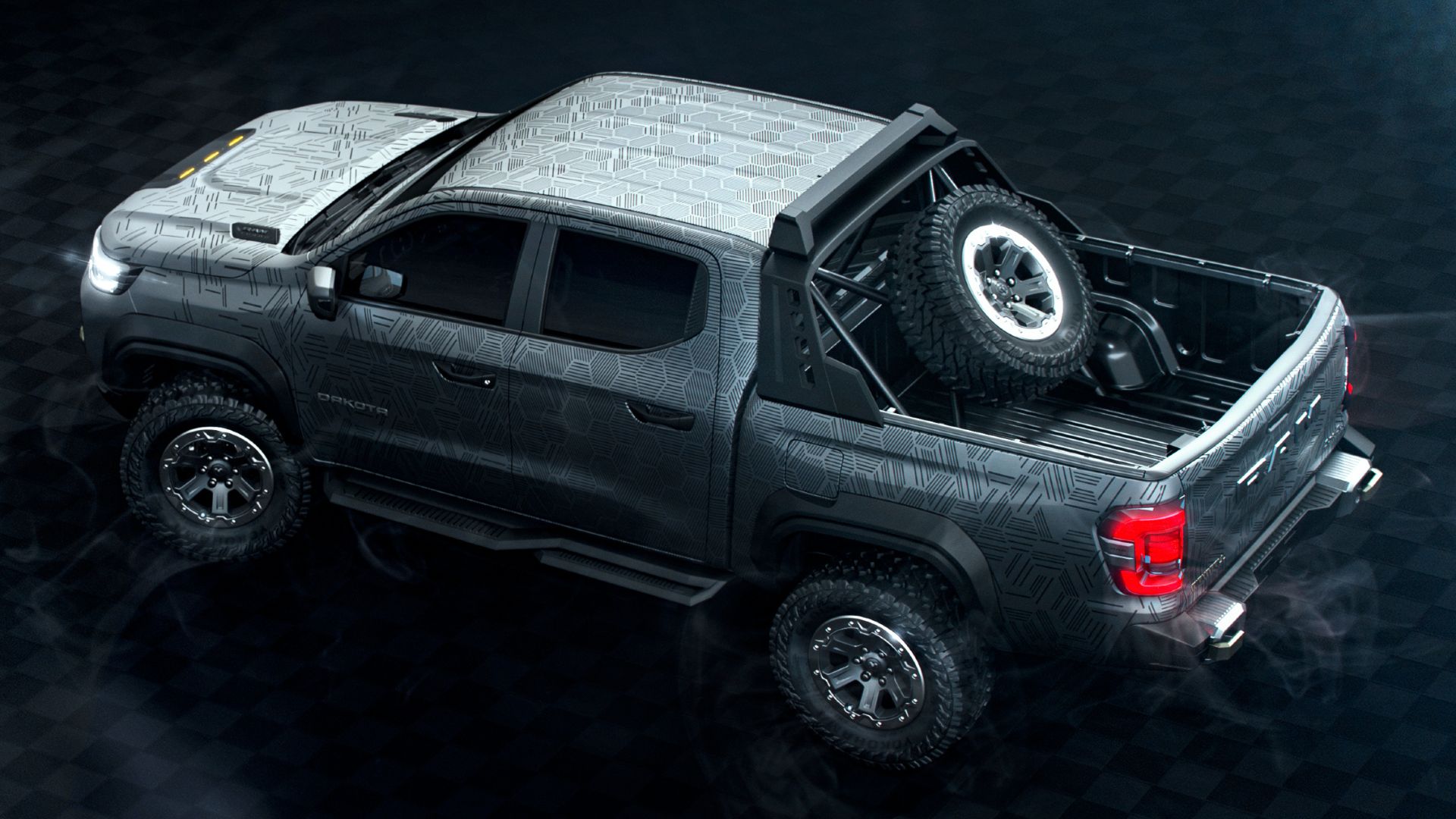 Para celebrar esse marco na história da marca, a Dakota Nightfall Concept recebeu uma pintura exclusiva, com grafismos únicos que simbolizam a força e poder que acompanham a Ram desde o princípio.