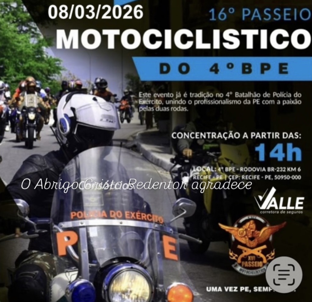 Vem aí o 16º Passeio Motociclístico do Batalhão de Polícia do Exército (4º BPE). Será dia 8 de março. A concentração tem início às 14h, na BR-232, Km 6, Curado, Recife-PE, em frente ao quartel.